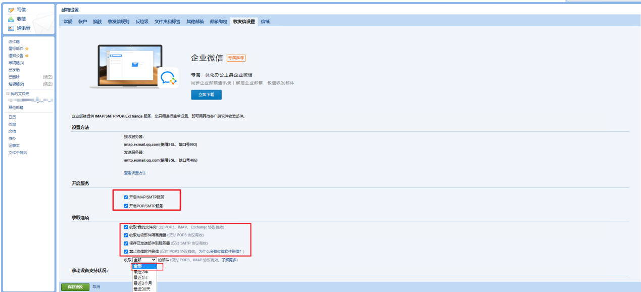 1. 开始邮箱搬家之前,登录学校邮箱-->设置-->收发信设置,开启IMAP和POP服务后,并将“收取选项”全部勾选,然后将IMAP协议设置为:收取全部邮件。
