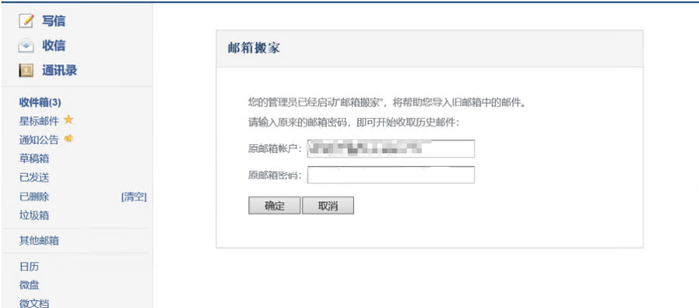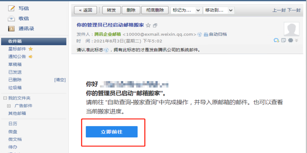2.进入新邮件系统中,打开管理员发来的“你的管理员已经启动邮箱搬家”邮件,点击邮件中“立即前往”,在弹出的对话框中输入邮箱账号密码,即可开始进行邮箱搬家(此步须在电脑上操作)。