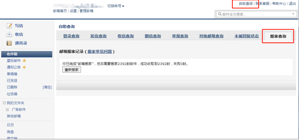 3.邮箱搬家开始后,可在“自助查询-搬家查询”中查看当前搬家进度。邮箱搬家由云端程序自动执行,在搬家过程中可以关闭网页和电脑,搬家完成后系统会自动发邮件提醒。