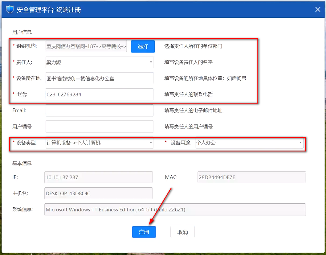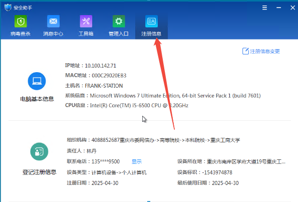 请各单位高度重视,严格履行网络安全主体责任,切实推进终端安全管理系统安装工作,原则上电子政务外网、互联网办公电脑要做到应装尽装、实名安装。请各单位网络安全和信息化协作员督促完成本部门完成互联网办公电脑终端安全软件客户端安装工作,并收集汇总保存本部门(学院)“注册信息”页面截图(如附件1)备查。同时,请并于5月13日下班前填报终端防护软件安装情况统计表(见附件2)并发信息技术中心汇总。