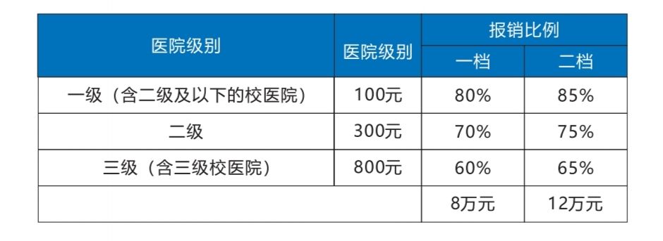 (一)门诊报销大学生医保普通门诊医药费用报销比例为一档75%、二档80%,全年报销封顶线500元,校外医院联网报销参照普通居民报销政策。