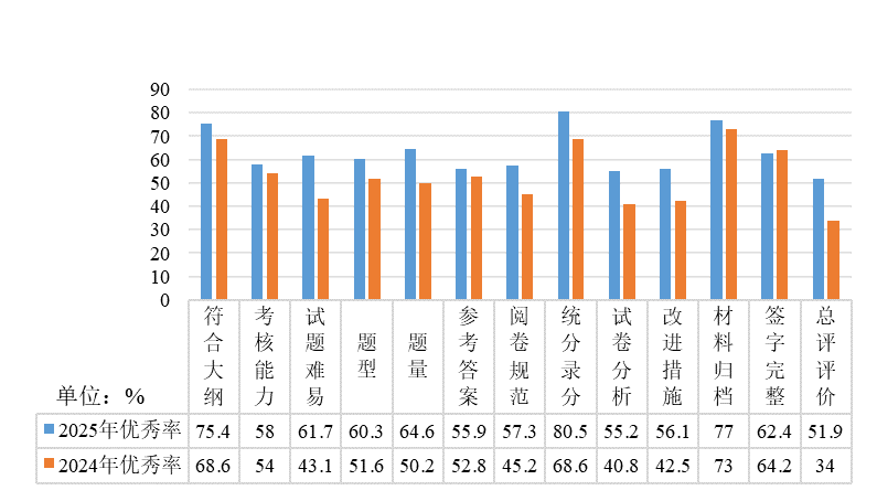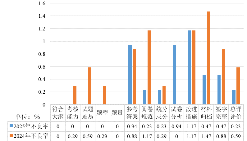 通过对比2024-2025学年和2023-2024学年试卷的抽查结果发现,2024-2025学年试卷各项指标的优秀率都有不同程度提高(图6),部分指标的不良率有所改善(图7)。