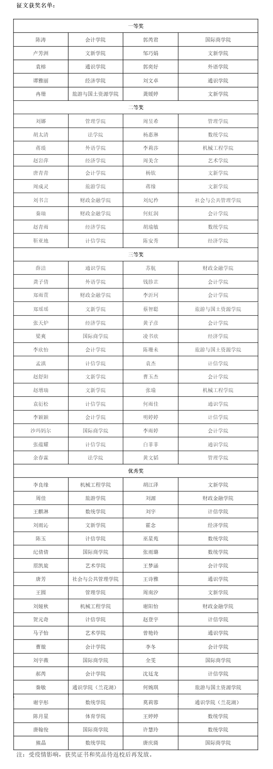 为给广大奋斗在一线的医护人员、基层干部或湖北、武汉的同学们送去温暖与正能量,为自己制定假期学习计划,为新学期加油鼓劲,由党委学工部、校团委、经济学院联合举办的“战‘疫’两地书”主题征文活动共收到稿件365篇,经评审专家严格审查打分,最终评选出一等奖10名、二等奖20名、三等奖30名、优秀奖40名,现将获奖作者及文章题目公布如下: