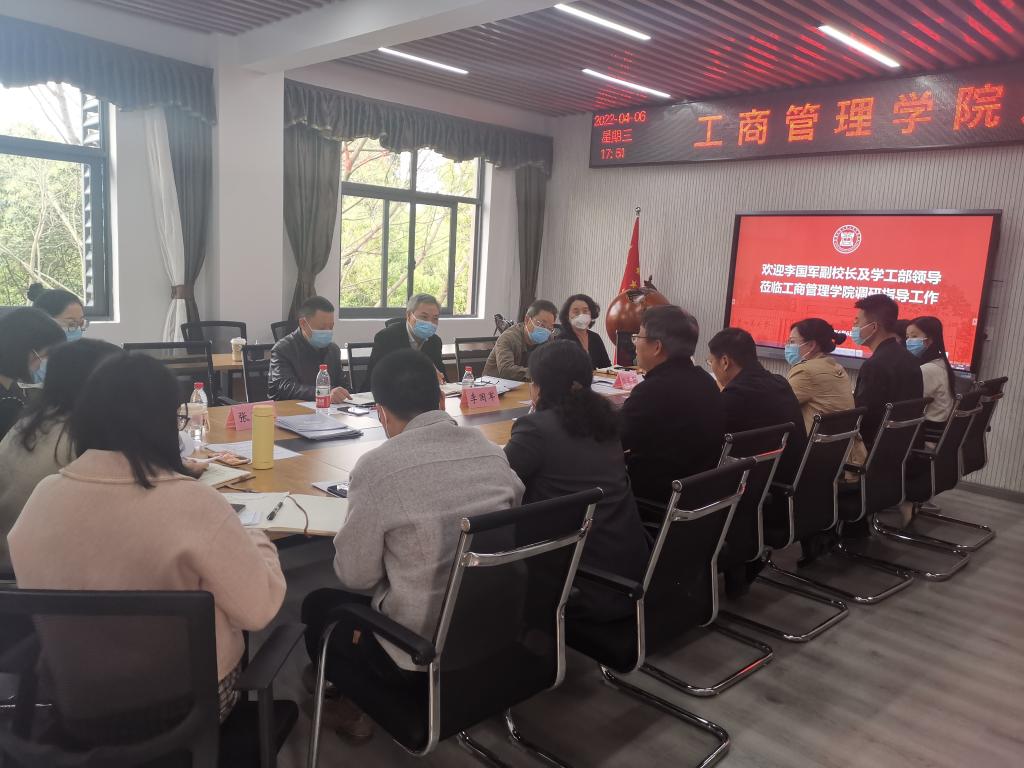 李国军对工商管理学院的各项工作给予了充分肯定。他强调,一是当前疫情防控工作是头等大事,对政策要理解到位、执行到位,要做到底数清、情况明、数据准。二是面对严峻的就业形势、与日俱增的就业压力大,学院要强化毕业生先就业再择业的思想,深入推进全员促就业模式,发挥友好企业、优秀校友等资源优势,提供更多供需契合的工作岗位信息,加大就业工作的推进力度。三是立足学生心理健康教育管理工作在前期取得的初步成效,学院要加强对硬核个案的集体分析、研判,在总结中探索可推广工作模式,切实提高工作的针对性和时效性,最大限度减少校园危机事件的发生,做到青年学生成长少出事、不出格。