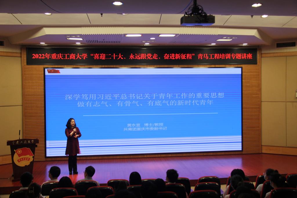 为迎接党的二十大胜利召开,引导广大青年团员深入学习贯彻习近平新时代中国特色社会主义思想,培养信仰坚定、能力突出、素质优秀、作风过硬的团学骨干,4月22日下午,校团委在博智楼7200报告厅举办2022年买球(中国)官方网站“喜迎二十大、永远跟党走、奋进新征程”青马工程培训专题讲座。共青团重庆市委副书记黄永宜作了题为《深学笃用习近平总书记关于青年工作的重要思想 做有志气、有骨气、有底气的新时代青年》的专题讲授。校团委全体专职团干、校级“青马工程”培训班学员、团员代表参与活动。