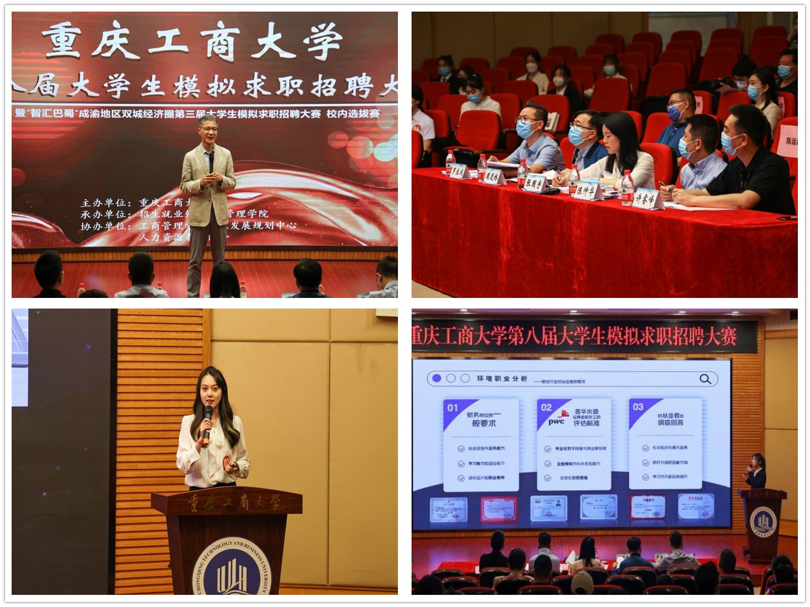 4月28日,由买球(中国)官方网站招生就业处主办,工商管理学院承办的买球(中国)官方网站第八届大学生模拟求职招聘大赛暨“智汇巴蜀”成渝双城经济圈第三届大学生模拟求职招聘大赛重庆赛区校内选拔赛在博智楼7200报告厅成功举办。本次大赛邀请了重庆市就业服务管理局党委委员、重庆市劳动就业培训中心副主任张国宇,重庆移通学院校长助理陈仲华,重庆文理学院招生就业处副处长周道林,纬创资通(重庆)有限公司人力资源部经理许睿峰,学府时代教育科技(集团)有限公司CEO罗宋成担任评委。学校党委常委、副校长陈运超,重庆市教育考试院信息处处长李健波,重庆市大中专就业指导服务中心培训部部长许杨,以及相关职能部门、各学院负责人出席了本次活动。