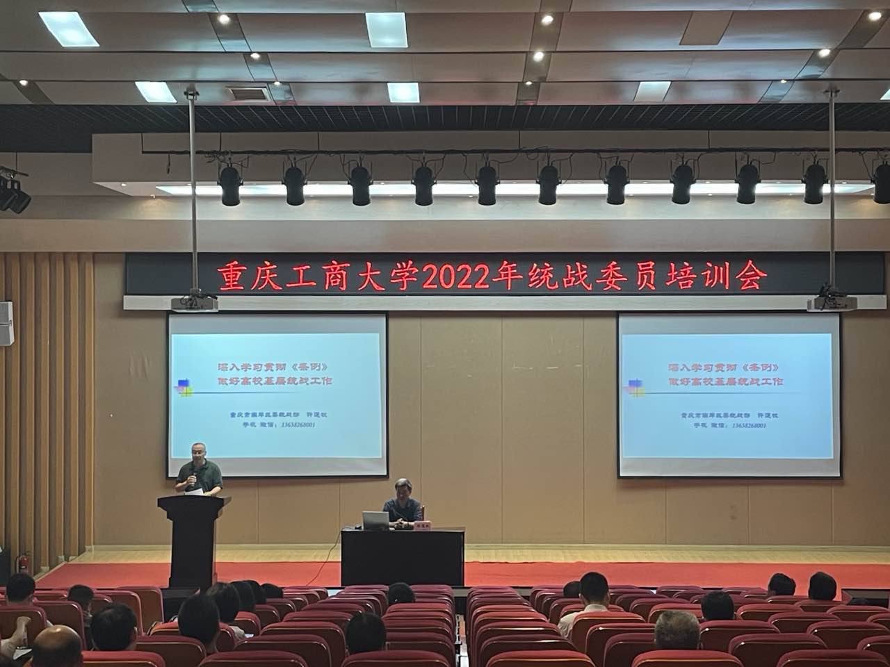6月10日下午,我校在田家炳书院209报告厅召开了2022年度全校统战委员培训会。本次会议邀请南岸区委统战部副部长、区台办主任、区政府侨务办主任许道权同志做专题讲座。学校各二级单位党组织、学院教工党支部和各机关党支部统战委员近80人参加了培训会。会议由学校党委统战部常务副部长陈松主持。