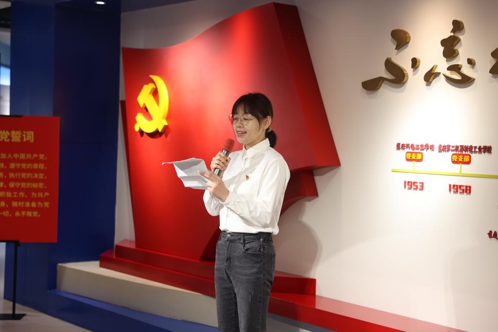 入党宣誓及重温入党誓词由宋豫领誓。面对鲜红的党旗,胸戴党徽的党员们在领誓人的带领下,神情庄重,高举右拳,庄严宣誓:“我志愿加入中国共产党,拥护党的纲领,遵守党的章程,履行党员义务,执行党的决定,严守党的纪律,保守党的秘密,对党忠诚,积极工作,为共产主义奋斗终身,随时准备为党和人民牺牲一切,永不叛党。”入党誓词,句句千钧,诚挚的誓言,表达了身为新时代党员的责任和担当。