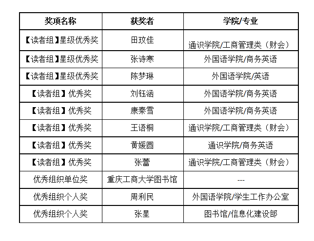 我校图书馆积极组织读者及馆员近五百余人报名参赛,在众多的参赛选手中,读者们以实力脱颖而出。其中,通识学院田玟佳等2名同学获得读者组星级优秀奖,外国语学院刘钰涵等5名同学获得读者优秀奖,买球(中国)官方网站图书馆获得优秀组织单位奖,外国语学院周利民老师和图书馆张星老师获得优秀组织个人奖。