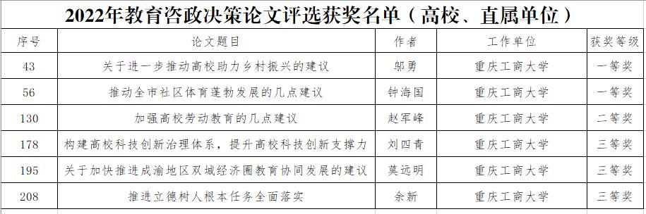 近日,重庆市教育委员会印发《重庆市教育委员会关于2022年教育咨政决策论文评选结果的通报》,我校获一等奖2篇、二等奖1篇、三等奖3篇,获奖总数位列市属高校前三名。学校智库建设成效进一步显现。