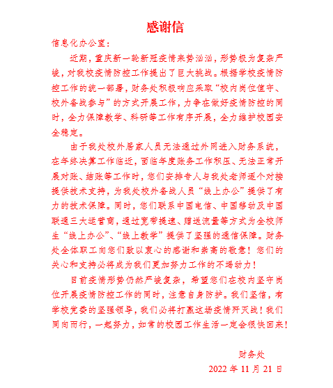 近日,学校信息化办公室收到了财务处发来的感谢信。对疫情期间,信息化办公室为财务处年终结算工作做出的贡献表示充分感谢。