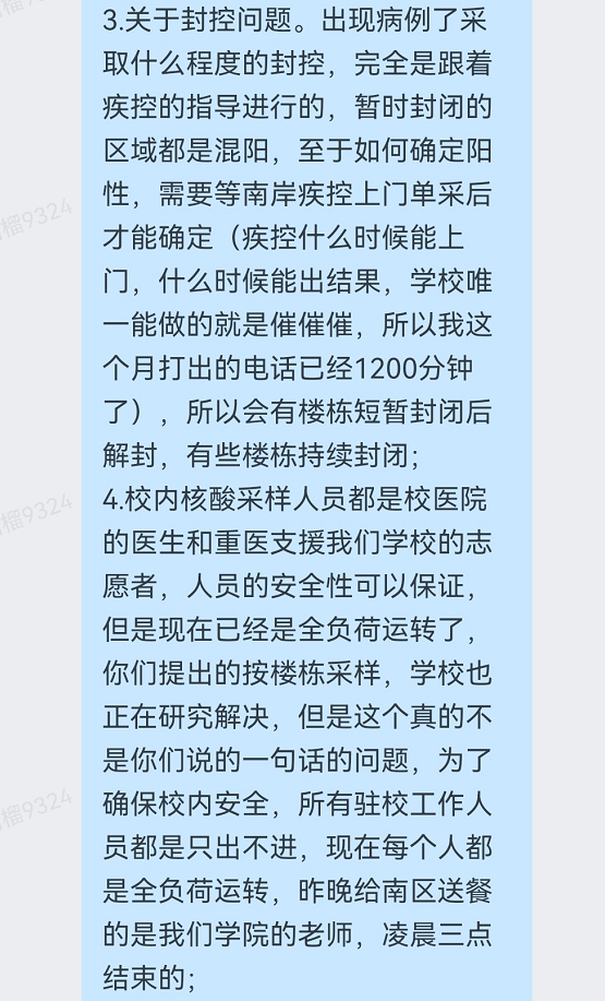 “不仅是高校,社会面上大多数快递也是暂停了的,我双十一给孩子买的棉服也在集散点躺着的”“昨晚给南区送餐的是我们学院的老师,凌晨三点结束的。”“每个人都在抗,没有人可以置身事外。”