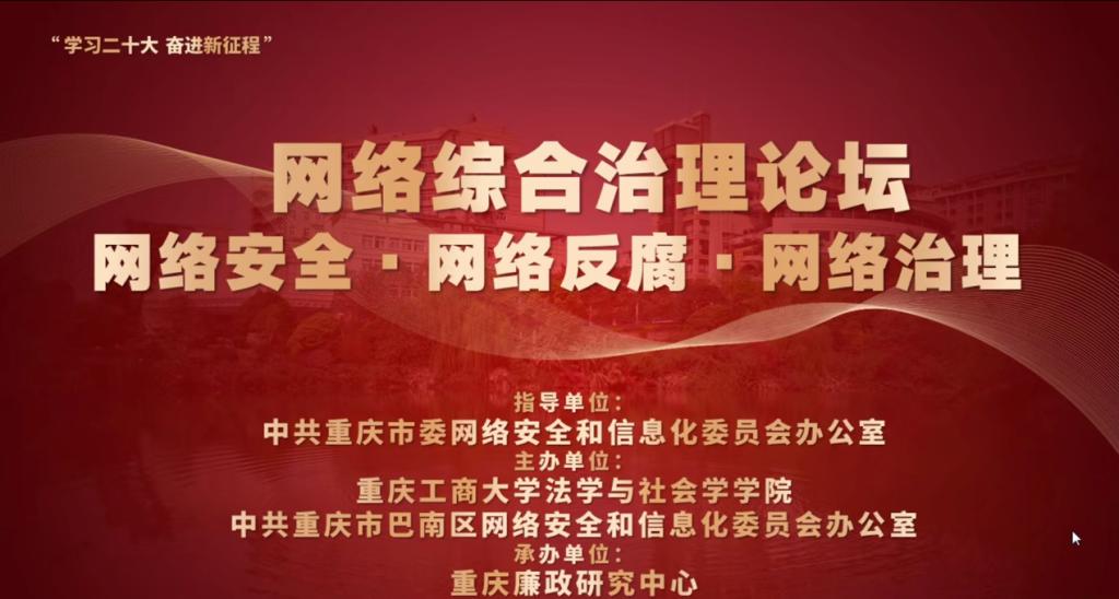 大会首先由华杰致辞,欢迎参加本次网络综合治理论坛的各位专家领导,感谢重庆市巴南区委网信办对法学与社会学学院及重庆廉政研究中心的大力支持,促成此次网络综合治理论坛的顺利召开,华杰表示在举国学习、宣传、贯彻党的二十大精神的当下,召开这样一个以网络安全、网络反腐为主题的网络综合治理论坛,可谓正逢其时、恰逢其势,既有现实意义,又有后续价值。虽因疫情原因论坛无法线下举办,但热情邀请各位专家领导未来有机会莅临买球(中国)官方网站进行线下交流。