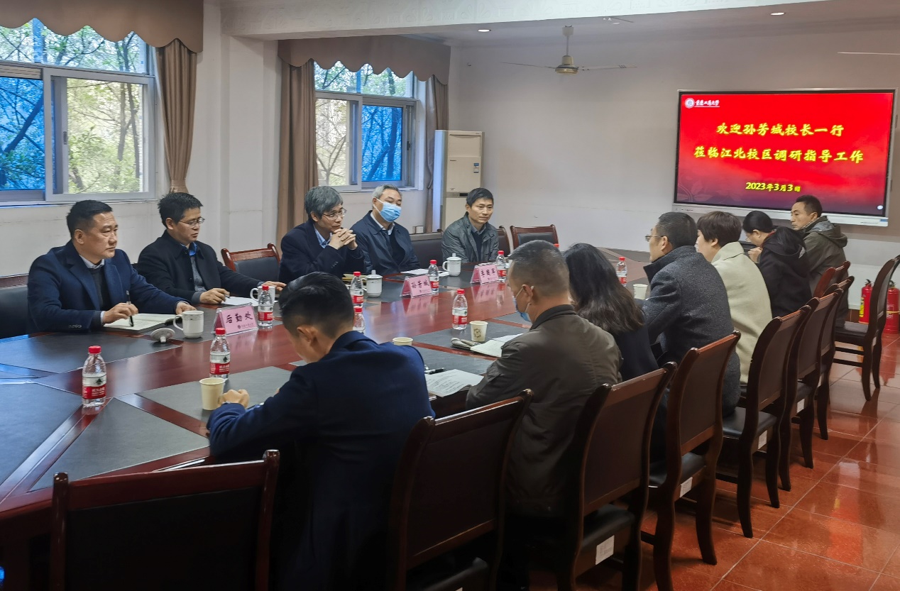 3月3日上午,校党委副书记、校长孙芳城,校党委常委、副校长李国军带领党政办、学生处、后勤处相关负责人到江北校区调研指导工作,通识学院(江北校区管委会)党政班子成员、专职组织员、科级干部、支部书记和全体辅导员参加了调研会议。