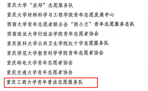 我校法学与社会学学院青年普法志愿服务队获评第九届重庆青年志愿者优秀集体,校团委王微老师获评优秀工作者,艺术学院郭本玲老师、经济学院2020级税收学专业2班学生李昂获评优秀个人。