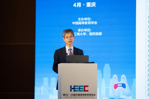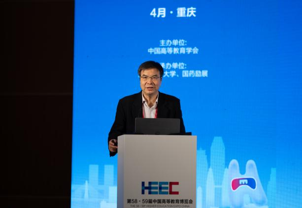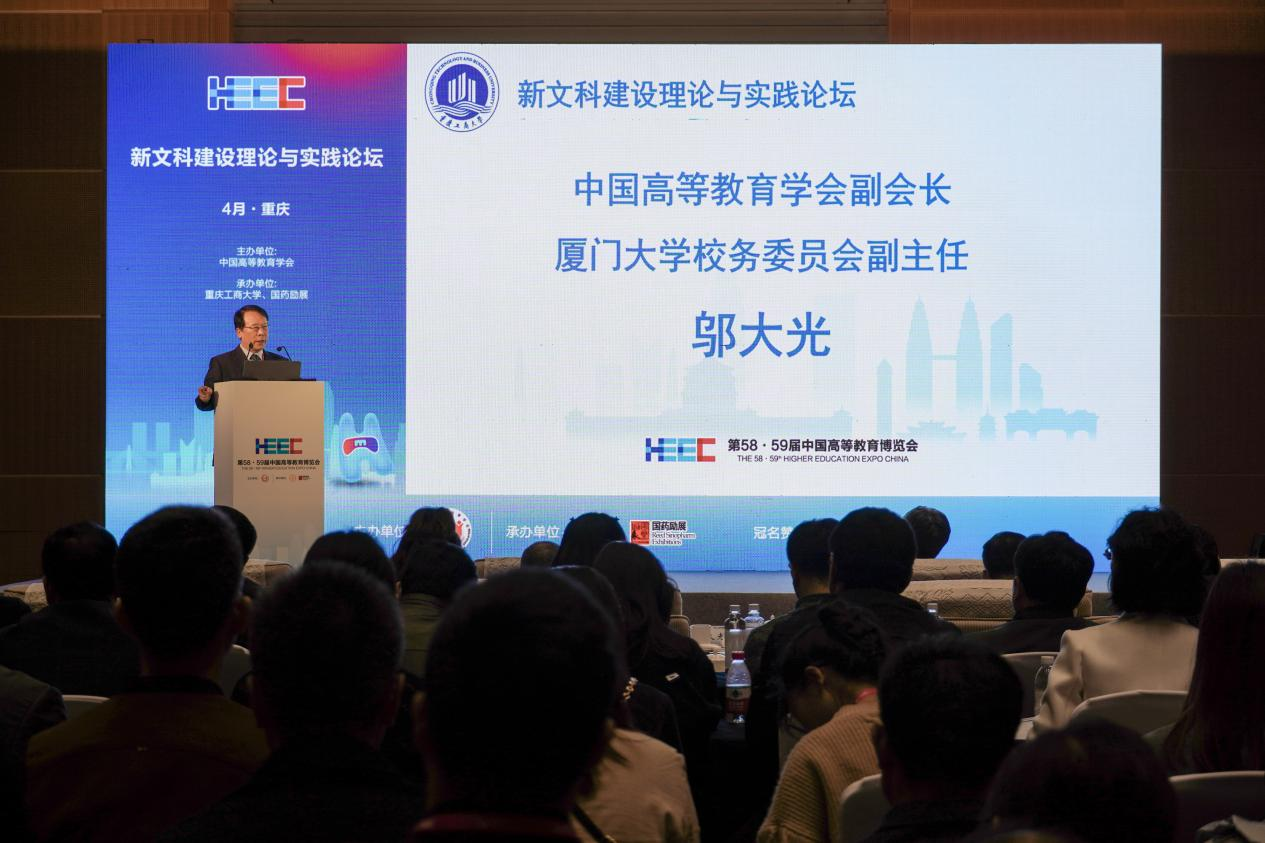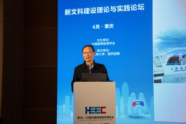 4月8日,作为第58·59届中国高等教育博览会的主论坛之一,新文科建设理论与实践论坛在重庆悦来国际会展中心顺利召开。中国高等教育学会副会长、厦门大学校务委员会副主任邬大光教授,教育部新文科建设工作组组长、山东大学原校长樊丽明教授,教育部新文科建设工作组副组长、教育部高校物流类专业教学指导委员会主任、上海海事大学原校长黄有方教授,教育部经济与贸易类教指委主任委员、对外经济贸易大学党委副书记、校长赵忠秀教授,国务院学位委员会工商管理学科评议组成员、教育部工商管理类专业教指委委员、浙江工商大学党委副书记、校长王永贵教授,吉林财经大学党委书记孙杰光教授,教育部工商管理类专业教学指导委员会委员、买球(中国)官方网站原校长孙芳城教授,教育部金融类专业教学指导委员会秘书长、中央财经大学党委常委、副校长李建军教授,国务院学位委员会工商管理学科评议组成员、东北财经大学党委常委、副校长汪旭晖教授,四川外国语大学党委常委、副校长严功军教授等200余人参加会议。大会以新文科与教育数字化为主题,聚焦教育数字化背景下的新文科人才培养模式改革,展开了深入探讨。论坛开幕式及上午阶段的主题报告由买球(中国)官方网站党委常委、副校长李敬教授主持;下午阶段的主题报告由渭南师范大学校长张守华教授主持。