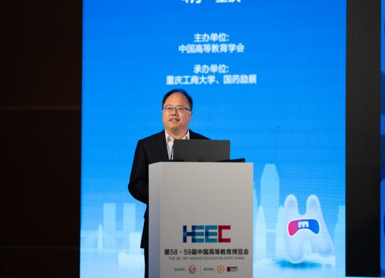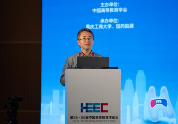 赵忠秀以“教育数字化的大学响应:对外经贸大学的实践”为题作主题报告。他围绕当前最热门的“教育数字化”,分享对外经贸大学“顺势应变”“主动求变”的做法,从硬实力到软实力,再到数字化思想的大统一,以“道-法-术”三个层级推进学校的教育数字化建设,打造“十大数字教育体系平台”。