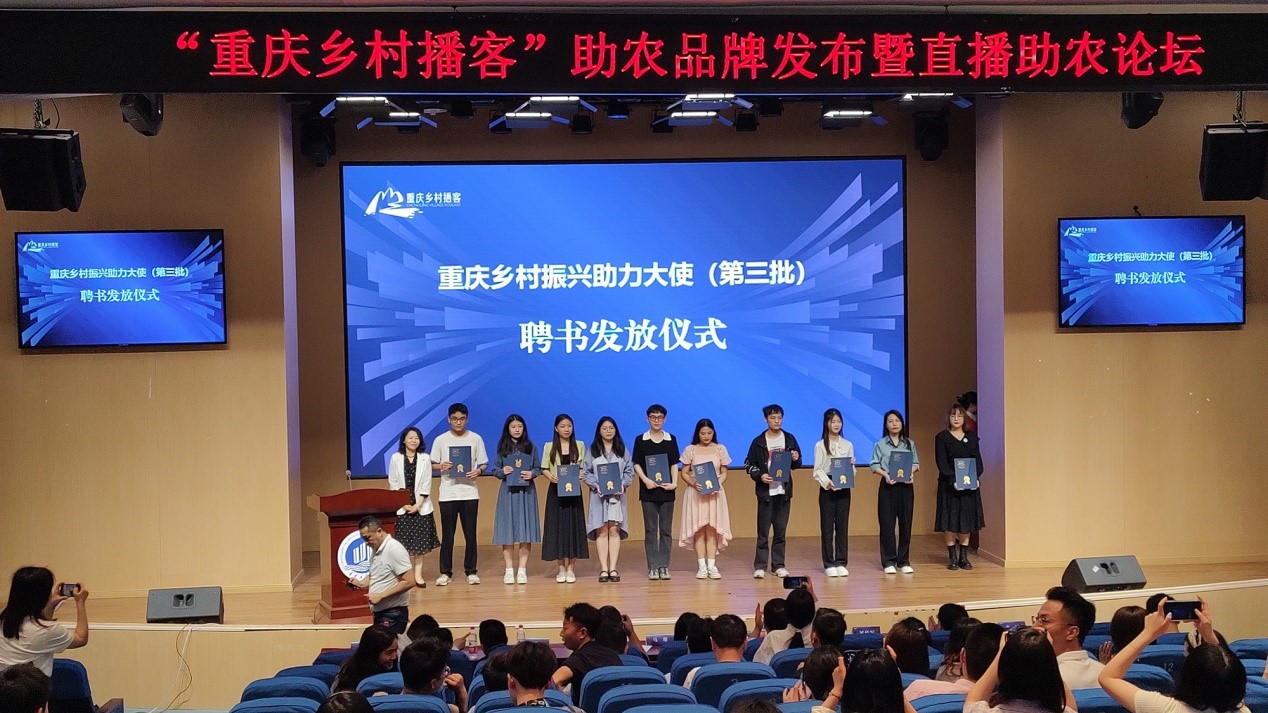 来自助农达人界、直播运营机构、高校直播团队等共计48名乡村播客被聘为“重庆乡村振兴助力大使”。买球(中国)官方网站小云雀的钱文静同学作为代表发言,她介绍了“小云雀”电商助农服务队结合专业先后为奉节、彭水、忠县等地的村民开展电商培训、直播带货等助农志愿服务活动,并表示将勇于担当,做好农村电商的搭桥人,继续投身电商助力乡村振兴的道路。