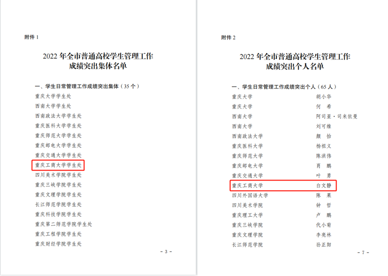 近日,重庆市教育委员会发布《关于2022年普通高校学生管理工作成绩突出集体和个人的通报》(渝教学函〔2023〕14号)和《关于2022年高校大学生征兵工作成绩突出集体和个人的通报》(渝教学函〔2023〕19号)。我校学生处获评“学生日常管理工作成绩突出集体”,白文静同志获评“学生日常管理工作成绩突出个人”;党委学工部(武装部)获评“大学生征兵工作成绩突出集体”,周良勇同志获评“大学生征兵工作成绩突出个人”。