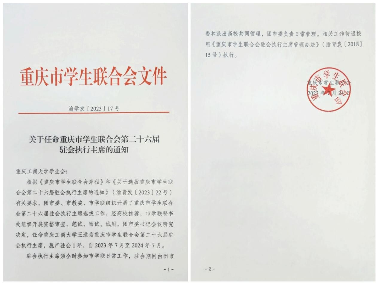 按照《重庆市学生联合会章程》《关于选拔重庆市学生联合会第二十六届驻会执行主席的通知》有关规定,团市委、市教委、市学联组织开展了重庆市学生联合会第二十六届驻会执行主席选拔工作。经组织选拔、考察并报团市委书记会议研究决定,我校文学与新闻学院王澈同学当选重庆市学联第二十六届驻会执行主席,驻会时间为2023年7月至2024年7月。这是继去年国际商学院钱世淋同学当选市学联第二十五届驻会执行主席后,我校学生第二次成功当选。