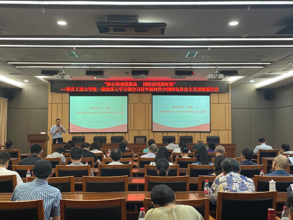 为全面贯彻落实中共二十大精神,推进校内各民主党派、无党派人士和党外知识分子持续深入开展“凝心铸魂强根基 团结奋进新征程”主题教育,学深悟透笃行习近平新时代中国特色社会主义思想,不断巩固与中国共产党团结奋斗的共同思想政治基础。9月22日下午,我校在新图书馆会议中心一会议室举行“凝心铸魂强根基 团结奋进新征程”——买球(中国)官方网站统一战线深入学习领会习近平新时代中国特色社会主义思想报告会,邀请重庆社会主义学院多党合作研究室的秦江明教授做主题报告,我校各民主党派基层组织和统战团体班子成员、成员代表共60余人参会。会议由学校党委常委、统战部常务副部长陈松主持。