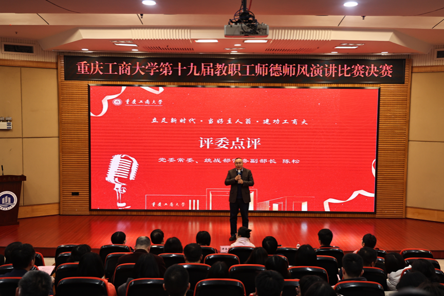12月1日下午,由校工会、党委教师工作部联合举办的“立足新时代·当好主人翁·建功工商大”系列活动之第十九届教职工师德师风演讲比赛在博智楼7200学术报告厅举行。学校党委书记曾维伦,党委副书记宋豫,学校各学院党委书记、各部门工会主席以及教职工代表共计150余人观看了比赛。比赛邀请了重庆市教科文卫体工会副主席袁菁霞,学校党委常委、组织部部长郑夕春,党委常委、统战部常务副部长陈松,党政办公室副主任、档案馆馆长蒋年韬,党委教师工作部部长、人事处处长林文军,党委宣传部副部长陆嘉,团委副书记胡婧婷担任评委。