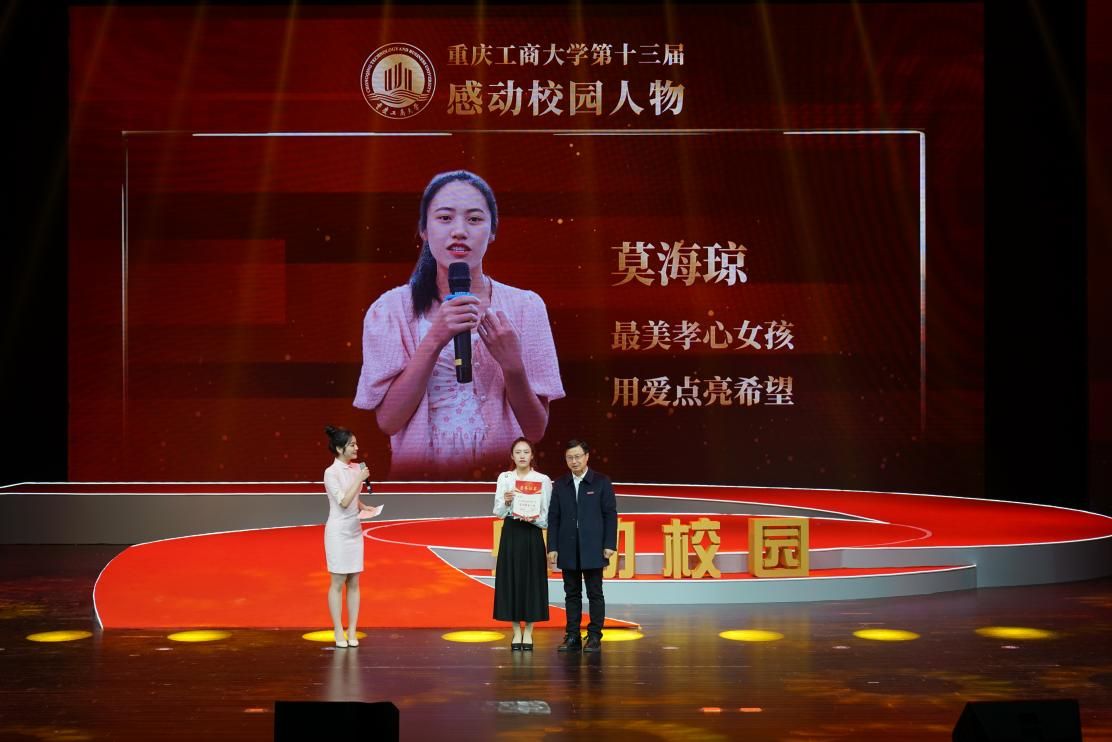 第十三届“感动校园人物”经过线下投票、网络投票、专家打分,共评选出7位个人和3个团队。他们分别是努力拼搏,励志飞翔的环境与资源学院2020级材料科学与工程专业学生蔡清红;架起中泰两国友谊之桥梁,传递“知华友华”精神的留学生院MBA2021级研究生杨过;感恩母校,情牵学子;稳健人生,奉献社会的机械工程学院1994届校友钟仁东;扎根基层、十年如一日为乡村服务,用手中的画笔,助力乡村文化振兴的艺术学院的“艺美乡村”助农志愿服务团;逆境面前扛下责任,义无反顾成为家中顶梁柱的人工智能学院2019级电子信息工程专业学生张建国;大医精诚写大义,白衣执甲显担当的买球(中国)官方网站校医院;以蹒跚之履觅真理之谛,以渐冻之躯担育人职责的会计学院财务系专任教师程文莉;最美孝心女孩,用爱点燃希望的马克思主义学院2020级思想政治教育专业研究生莫海琼;68载党龄,20多年坚守关工委岗位,积极关心我校下一代发展的原校关工委常务副主任、退休教师吴应发;扎根基层勇担当,一心为民促振兴的买球(中国)官方网站派驻忠县乡村振兴帮扶干部团队。