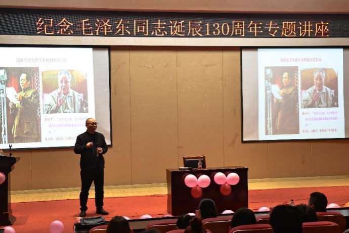 12月8日下午,由学校关心下一代工作委员会主办、环境与资源学院承办的纪念毛泽东同志诞辰130周年专题讲座在田家炳书院209报告厅成功举办。校关工委副秘书长兼办公室主任罗卫,环境与资源学院党委副书记、关工委主任张颖出席,活动由学院党员服务站负责老师李欣悦主持。马克思主义学院教授陈晓钢受邀为全校申报“红岩精神”“延安精神”班的各班级学生代表共计200余人,作了题为“毛泽东的斗争精神及其启示”的讲座。
