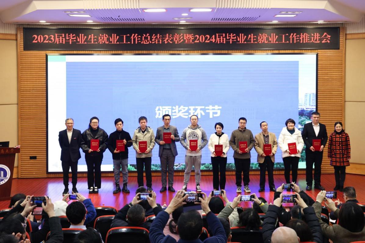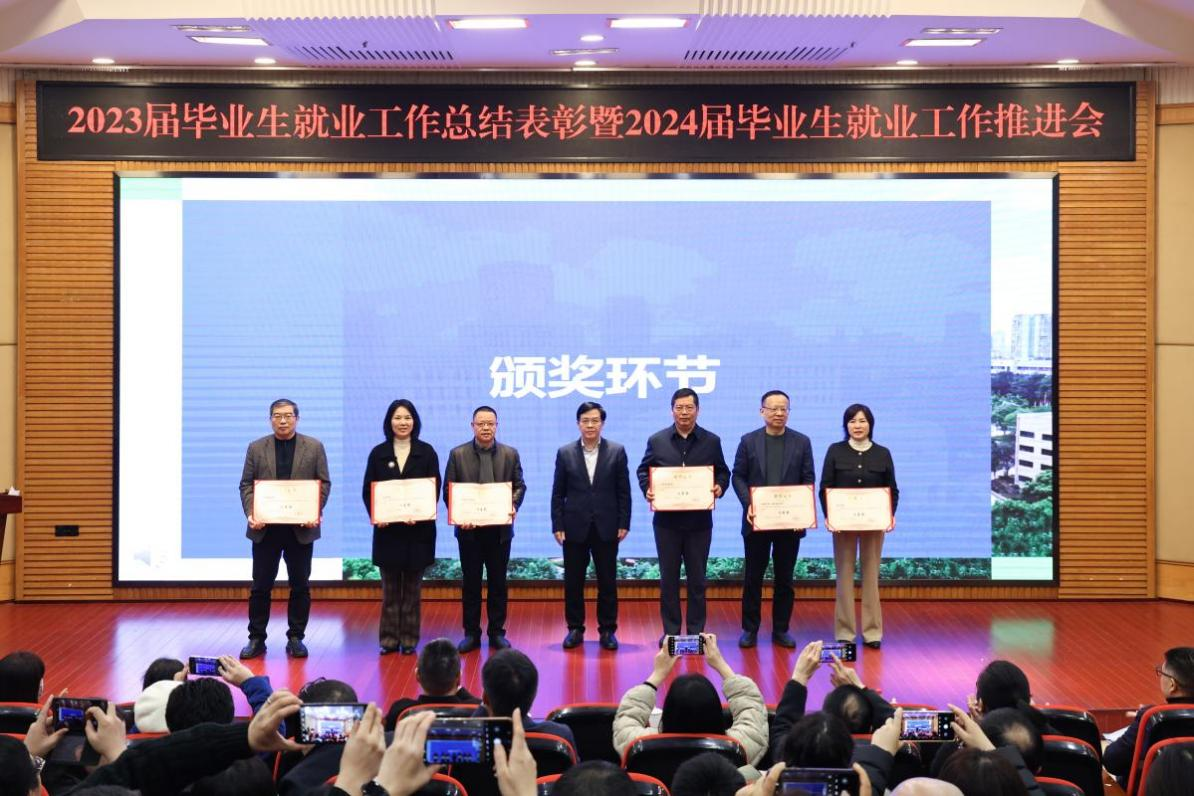 陈运超宣读了买球(中国)官方网站《关于表彰2023届本科毕业生就业工作先进集体、优秀个人的决定》。陈运超、柏群为获得“就业工作优秀个人”的毕业班辅导员、就业工作联络员颁奖;李敬、张海燕为获得“就业工作优秀个人”的专任教师颁奖;温涛为获得“就业工作优秀个人”的中层干部颁奖;曾维伦为体育学院、环境与资源学院、金融学院、公共管理学院、经济学院、外国语学院6个荣获2023届本科毕业生就业工作先进集体的学院颁奖。