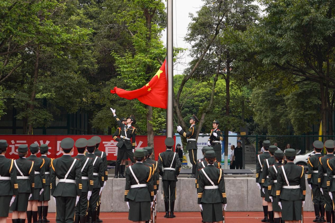 入场式后,国旗护卫队的队员们迈着坚定有力的步伐,眼神坚毅,身姿笔挺,以昂扬的姿态将国旗护送至升旗台。伴随着雄壮的国歌声,鲜艳的五星红旗冉冉升起。现场师生庄严肃立,向国旗行注目礼。