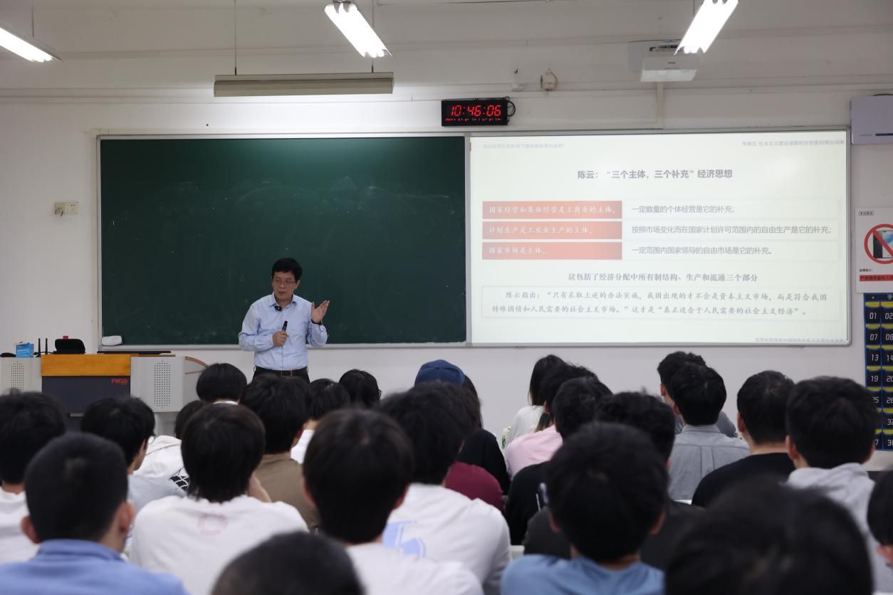 课上,曾维伦围绕“社会主义建设道路初步探索的理论成果”这一主题,深入讲解了在社会主义建设道路初步探索阶段,我国取得的重要理论成果。在授课过程中,曾维伦为同学们讲到,实现工业化是中国近代以来历史发展的必然要求,也是民族独立和国家富强的必要条件。中华人民共和国的成立,为我国实现工业化提供了根本的政治前提。社会主义革命和建设时期,毛泽东同志提出把马克思列宁主义基本原理同中国具体实际进行“第二次结合”,以毛泽东同志为主要代表的中国共产党人,结合新的实际丰富和发展毛泽东思想,提出关于社会主义建设的一系列重要思想,探索中国建设社会主义的道路,走出了一条适合我国国情的工业化道路。最后,曾维伦寄语学生,一定要以史为鉴、开创未来,从历史的经验中汲取智慧,坚定理想信念、树立远大目标,努力学习,踔厉奋发,为全面建设社会主义现代化国家,全面推进中华民族伟大复兴贡献自己的青春力量。