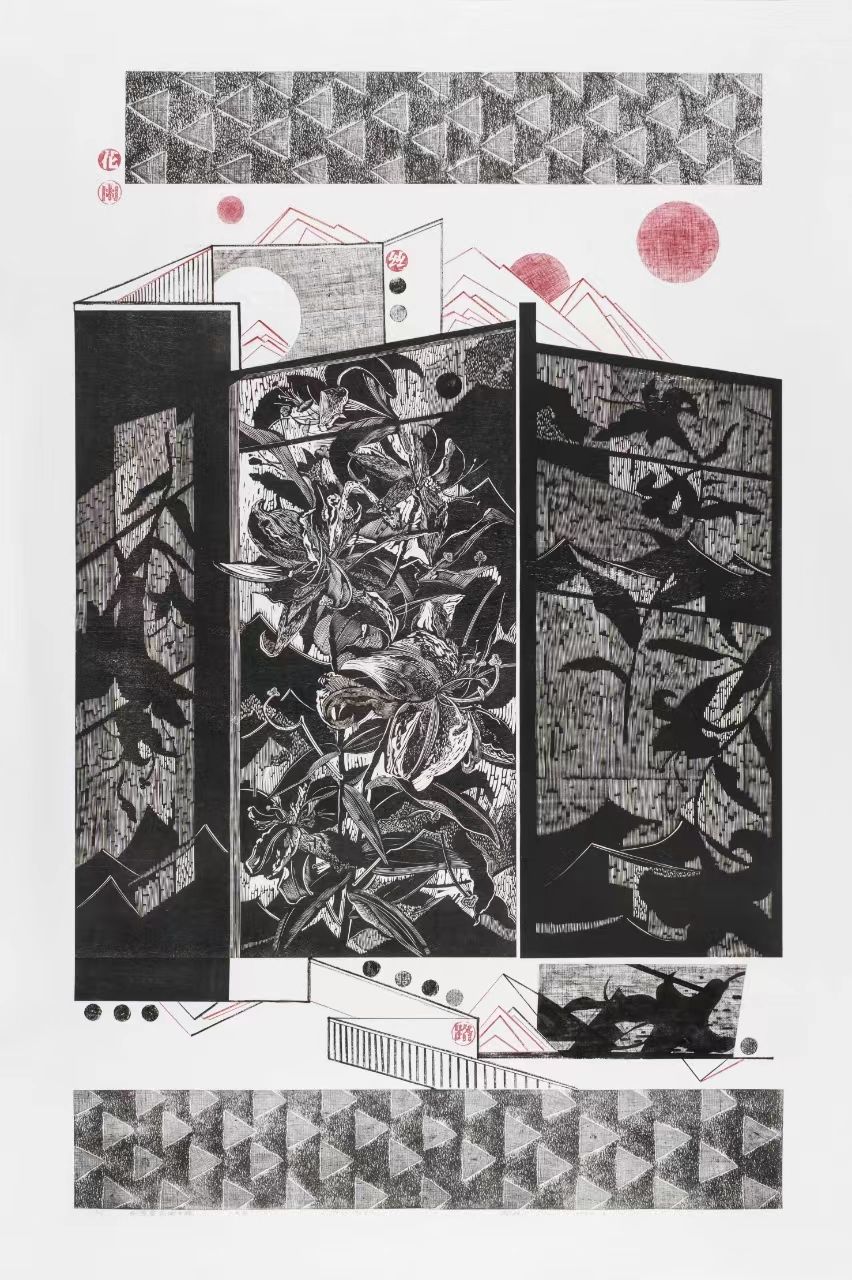 作品简介:版画作品《丝路繁花映日晖》以共建“一带一路”倡议为创作主旨,意在展现古老的丝绸之路留给人们的美好印象和想象,唤起人们对美好未来的憧憬。该作品形式感强,刀法的穿插变化形成丰富的黑白灰关系;红色的直线增加了画面的层次;大小各异的圆点并置其间,使画面更为活跃。主体折叠的屏风象征历史长河中的无数故事、无尽思索;怒放的百合花代表几千年的丝绸之路文明史辉煌而灿烂;红色线条勾勒出的层层山峦,象征人类伟大历史不断接力的道路,是历史最悠久、空间最广阔的道路,也是通向美好未来的道路;冉冉升起的红日象征祖国的明天更加繁盛璀璨,继续书写当代“丝路”,全面创新文明交流的新篇章。