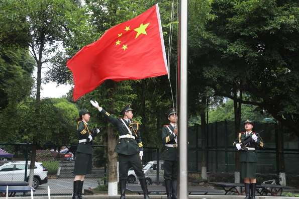 在庄严的国歌声中,鲜艳的五星红旗冉冉升起,军训总结表彰大会正式拉开帷幕。大会由成果汇报和总结表彰两部分组成。