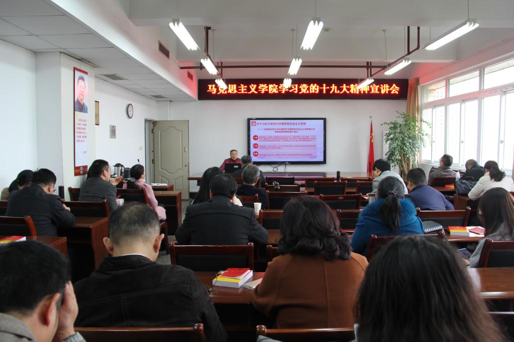 按照学校《深入学习、宣传和贯彻十九大精神实施意见》(重工商大委〔2017〕135)和党的十九大精神宣讲工作布置推进会会议要求,为扎实推动党的十九大精神进校园宣讲工作,11月24日下午,马克思主义学院召开了学习党的十九大精神宣讲会。党总支书记陈松同志在会上做了党的十九大精神宣讲,全体教师参加了会议。