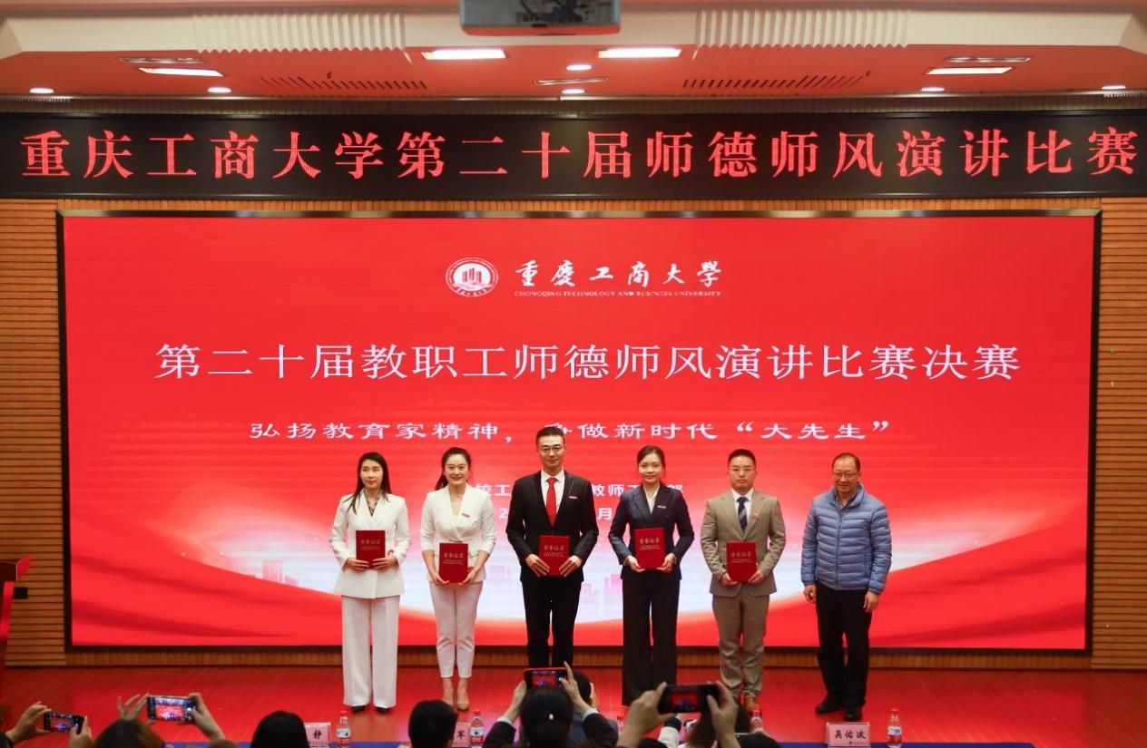11月22日下午,由校工会、党委教师工作部联合举办的“立足新时代·当好主人翁·建功工商大”第二十届教职工师德师风演讲比赛决赛在博智楼7200学术报告厅举行。学校党委书记曾维伦,党委副书记、工会主席宋豫,党委常委、副校长张波、李国军,各学院党委/党总支书记、各部门工会主席以及教职工代表等观看了决赛。决赛邀请了重庆第二师范学院文学与传媒学院副教授魏巍,我校机关党委书记、组织部副部长杨倩,党委教师工作部部长、人事处处长林文军,工会常务副主席王静,团委书记吴佑波担任评委。