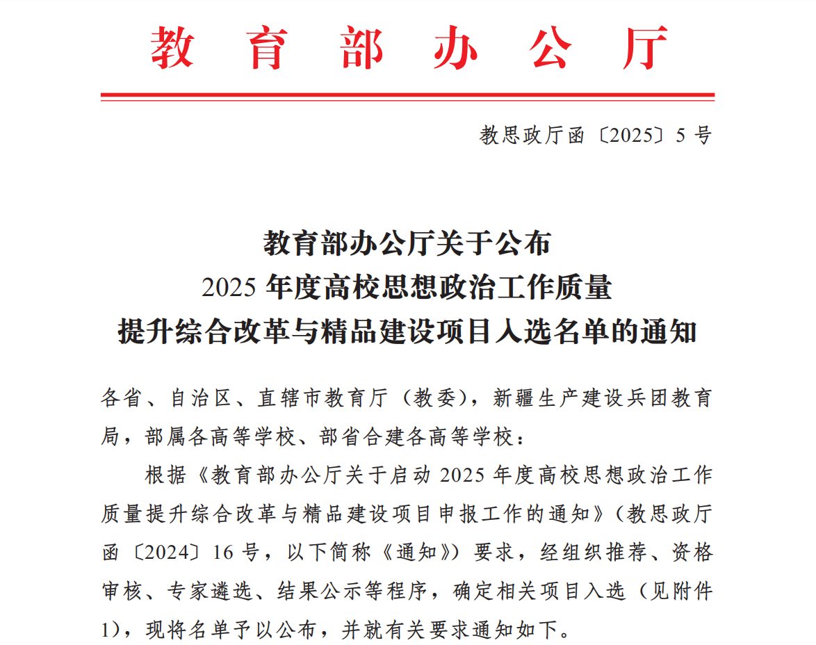 喜报!我校3个项目成功入选教育部2025年度高校思想政治工作质量提升综合改革与精品建设项目
