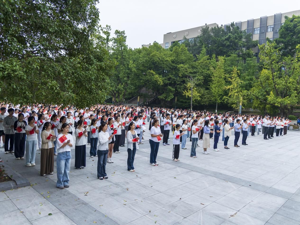 “我爱你中国/亲爱的母亲/我为你流泪/我为你自豪……”伴随着《我爱你中国》的奏乐,全体在场师生挥舞国旗,唱响爱国赞歌,共同庆祝中华人民共和国成立七十六周年。