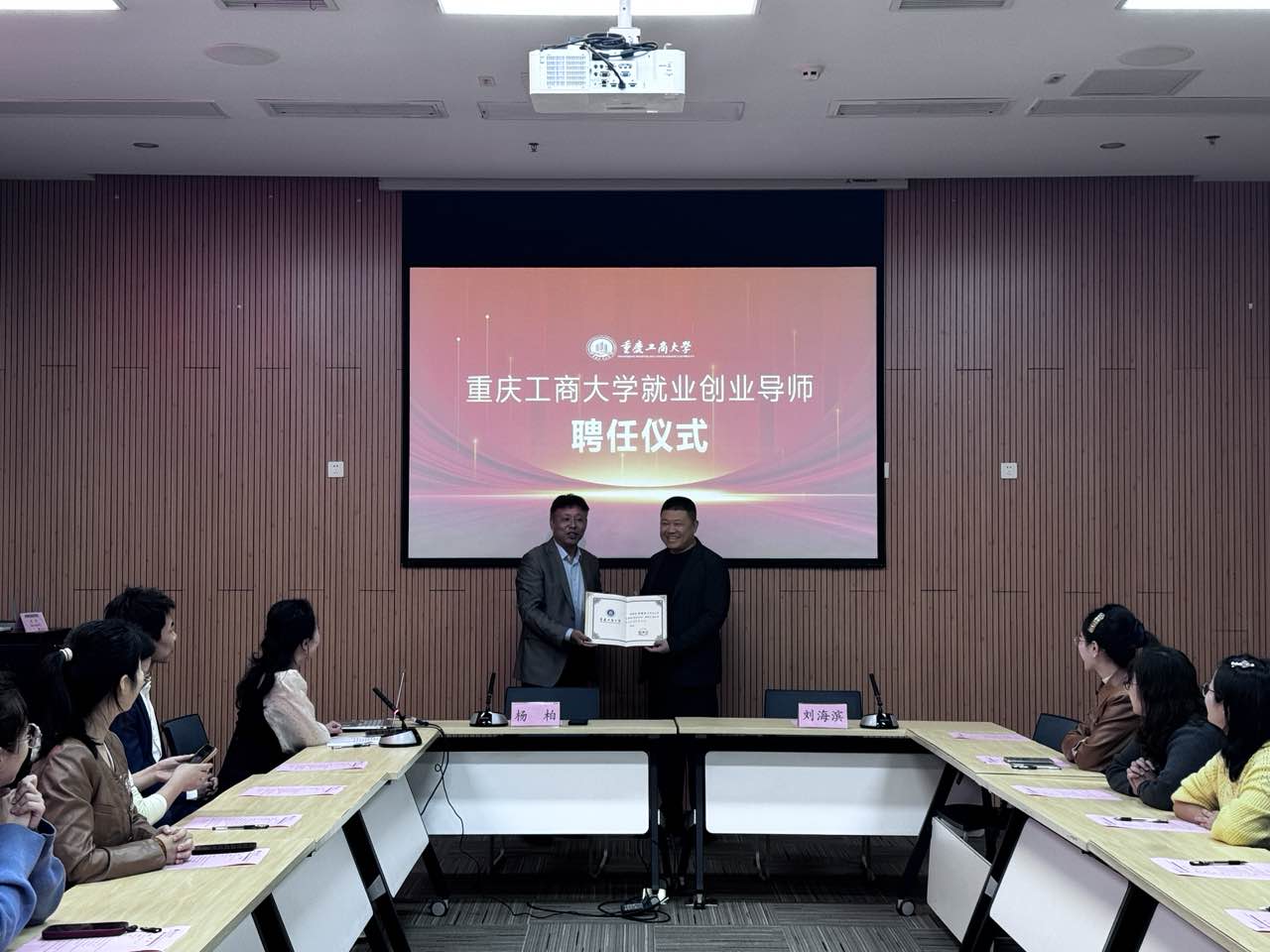 杨柏代表学校师生对刘海滨教授的加入致以热烈且诚挚的欢迎,并介绍了学校的办学定位与就业育人成果。杨柏指出,学校作为立足重庆、辐射西部、服务国家战略与区域经济社会发展的高水平财经类高校,始终坚守“为党育人、为国育才”初心,将“促进学生高质量就业、实现可持续发展”作为人才培养核心目标。学校创新构建“四环联动・四维助航・四大赋能”的“南山生芽”就业育人新模式,打造全链条生涯教育体系,在课程改革、品牌建设、协同赋能等方面成效显著。刘海滨教授的加入,既是对我校就业育人工作的高度认可,更让我们在深化生涯教育改革、助力学生“好就业,就好业”的道路上,拥有了更坚实的支撑、更清晰的方向和更强劲的信心。