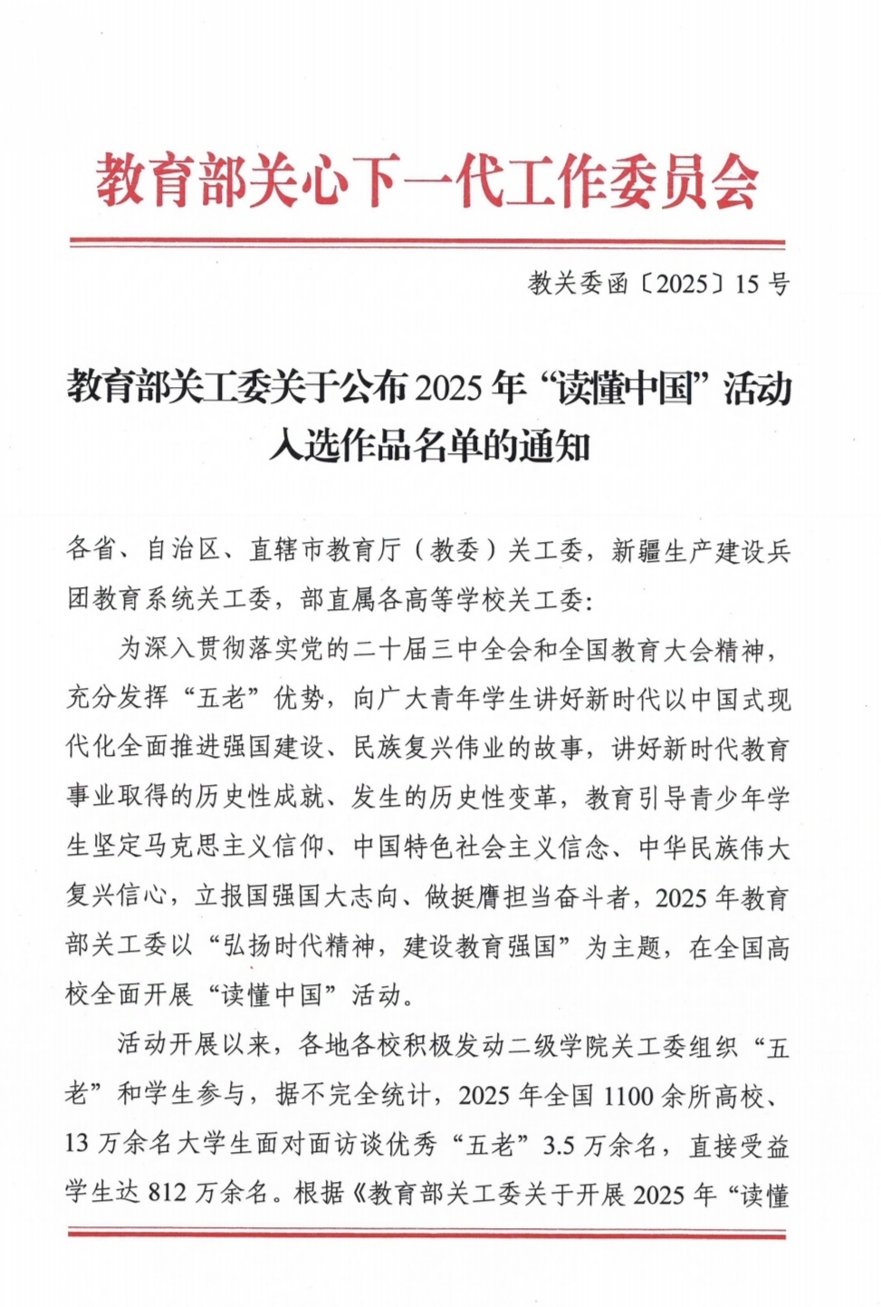 “读懂中国”活动是教育部关工委开展思想政治教育的品牌活动,旨在通过微视频、征文和舞台剧等形式,生动记录并宣传“五老”独特经历和深刻感悟,引导广大青少年学生坚定理想信念,厚植爱国主义情怀。2025年,围绕“弘扬时代精神,建设教育强国”活动主题,我校师生积极响应、精心创作,取得了优异成绩。