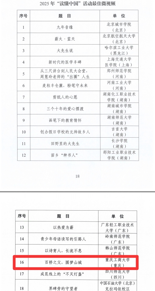近日,教育部关工委发布《关于公布2025年“读懂中国”活动入选作品名单的通知》,我校文学与新闻学院融媒体课程2024级专硕·火红笔锋团队采创的微视频《百桥之父,圆梦山城》荣获“最佳微视频”奖项,并将在中国教育电视台展播。此前,该作品已获重庆市教委“读懂中国”微视频一等奖。