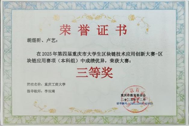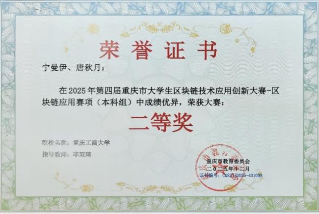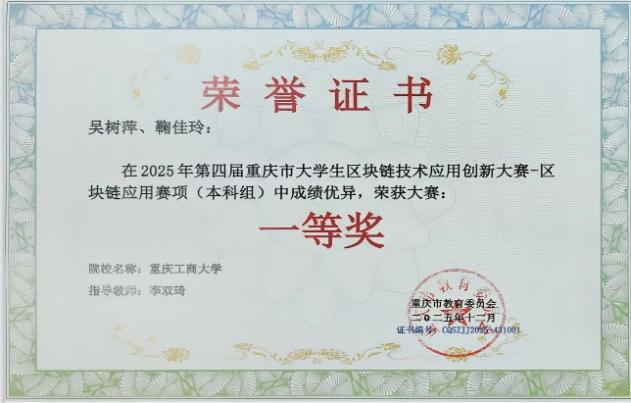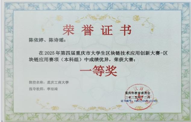 本次比赛设有“区块链技术组”与“区块链应用组”两个赛道。在赛事前期,经过前期校内选拔,我校金融学院8名同学晋级市级区块链应用组决赛。在激烈竞争中取得优异成绩,陈依婷、陈诗瑶、吴树萍、鞠佳玲4位同学获一等奖,宁曼伊、唐秋月2位同学获二等奖,胡煜昕、卢艺2位同学获三等奖,指导老师李双琦获“突出贡献个人”,买球(中国)官方网站获“突出贡献集体”。