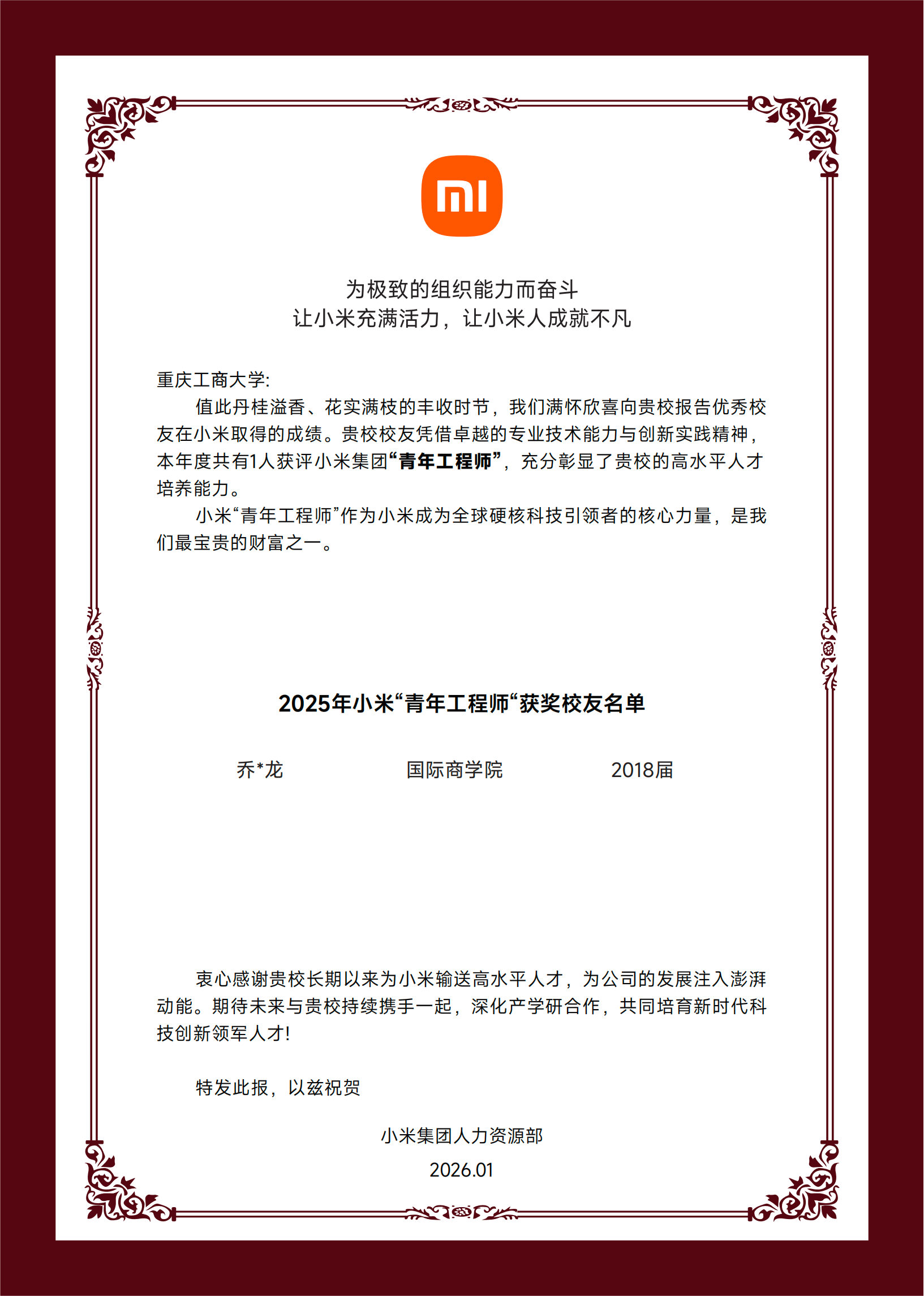 为感谢学校长期以来在人才培养方面的卓越成效,小米集团特向我校发来喜报,对乔一龙校友的成长与成就给予充分肯定,也对学校持续向企业输送高质量人才表示高度认可。乔一龙校友的优异表现,不仅是个人努力的结果,也彰显了我校育人理念与人才培养成效。