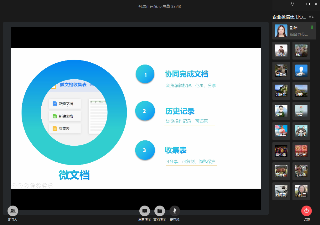 在会上,学院综合办副主任彭洁首先为大家介绍了这段时间她使用企业微信的心得,以及她利用企业微信在信息传递、数据收集、协同办公等方面的一些设计和体会。她分享了如何利用企业微信快速、准确地实现信息的分类推送,提高行政工作的沟通效率。详细介绍了如何利用企业微信中“群投票”、“群填表”、“微文档”、“收集表”等不同工具的实现数据的收集、汇总工作,并且对这四种工作各自的应用范围、优势以及限制做了概括。