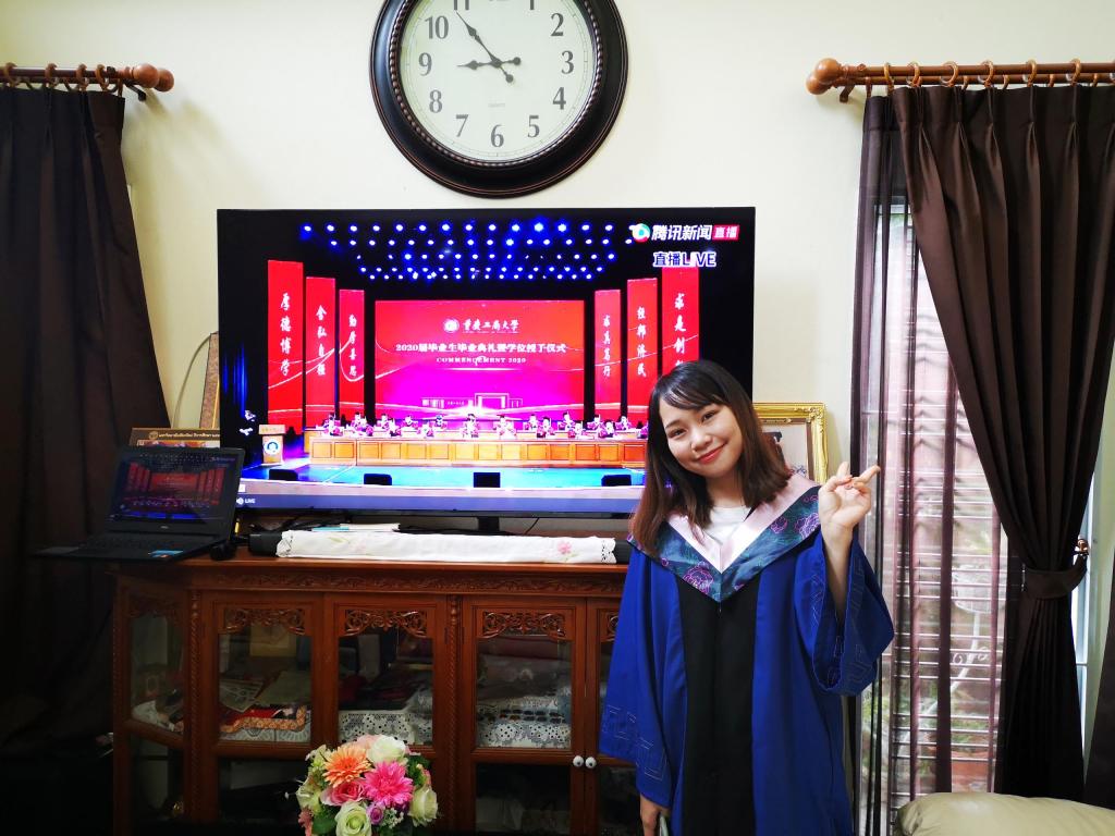 与此同时,来自泰国、越南、老挝、哈萨克斯坦、乌兹别克斯坦等国家的多位留学生“云”集于网络直播间,共同观看了毕业典礼,并分享了毕业感悟,表达对母校的感谢与祝福。我校越南籍国际经济与贸易专业本科生文财今天特意向公司请了假,专心观看毕业典礼。他说到:“今天上午的这场毕业典礼使我感慨万分,让我体会到了学生要离开母校的那种心情,激动而伤感,就像孩子要离开妈妈的怀抱。在买球(中国)官方网站学习的这几年,成为我一生中最重要的财富。感谢老师们对我的培养、支持与照顾。”来自泰国的企业管理专业研究生邱丽芳更是在家里穿着学位服观看了毕业典礼,仪式感十足。买球(中国)官方网站对他们来说,早已不是路过的风景,而是实实在在温暖的家!