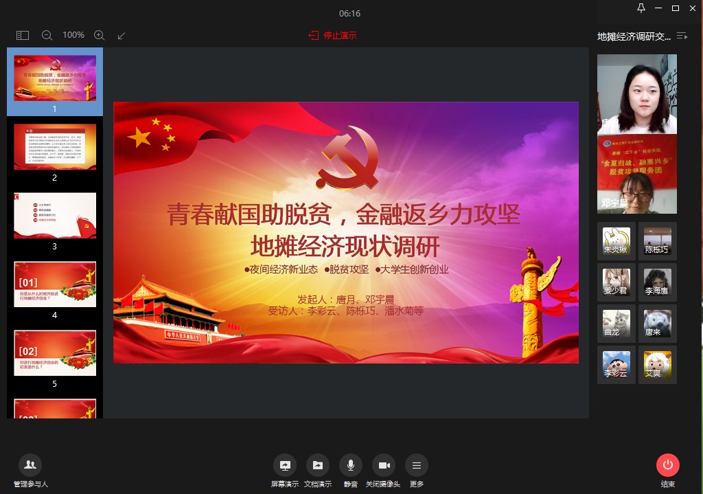 服务团队员通过视频会议的方式线上采访了贵州、青海等地进行摆地摊创新创业行动的金融学子。同学们向服务团队员介绍了当地政府相关部门对于地摊经济新业态的有效规范化措施,使队员们取得了不同于书本的知识。