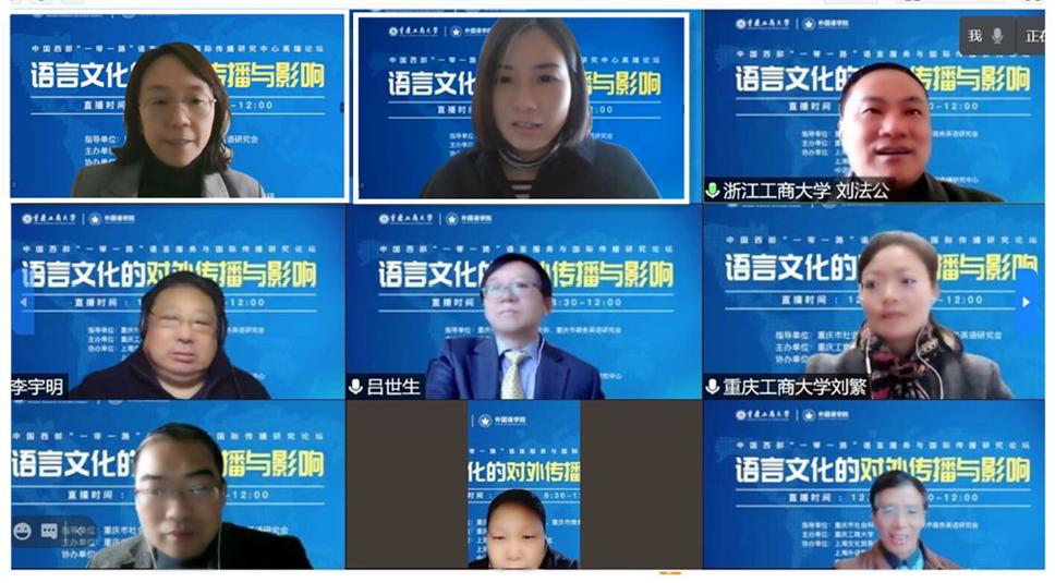 12月5日,我校在线召开“中国西部‘一带一路’语言服务与国际传播研究论坛”。本次论坛在重庆社会科学界联合会和重庆商务英语研究会的指导下,由买球(中国)官方网站主办,上海文化服务贸易基地、上海外语教育出版社和中语智汇科技有限公司等单位协办。本次论坛采用学术志平台在线直播方式,我校外国语学院班子成员和教师参加了论坛,在直播平台参与本次论坛的在线人数超过3600人。外国语学院院长周琳主持论坛开幕式。