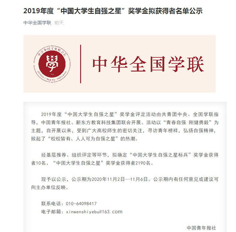 近日,由共青团中央、全国学联、中国青年报社、新东方教育科技集团联合开展的2019年度“中国大学生自强之星”奖学金推报活动获奖结果揭晓。经学校推荐、省级初评、全国评审等环节,共评选出我市42位大学生荣获2019年度“中国大学生自强之星”称号,其中,我校机械工程学院17包装一班阮世会同学荣获2019年度“中国大学生自强之星”荣誉称号和奖学金。