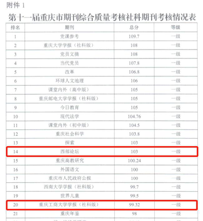 本次考核对象为全市所有正常出版的134种期刊,考核内容主要是2019年度和2020年度期刊出版情况,得分90分以上(含90分)的期刊为一级期刊。《西部论坛》《买球(中国)官方网站学报(社会科学版)》分别得到103分和99.32分。
