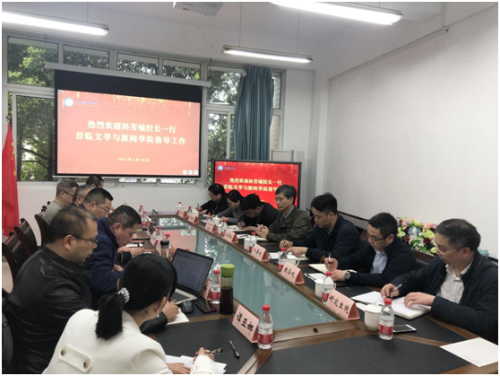 近日,校长孙芳城到文学与新闻学院调研指导工作。文学与新闻学院党政班子、系主任、教师代表、科级干部,以及学校人事处、教务处、科研处、研究生院、国际合作与交流处、资产管理处等相关部门负责人参加了座谈会。会议由文学与新闻学院院长王仕勇主持。