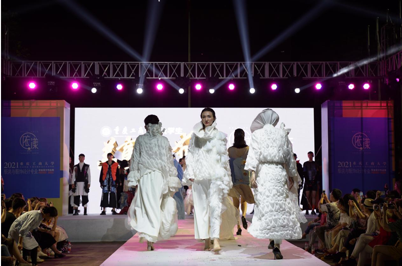 5月14日晚,2021届服装与服饰设计专业毕业服装秀在南岸校区含弘广场举行,本次服装秀系学校第二届美育文化节系列活动之一。校党委书记李志雄、副校长李国军出席活动,校友会副会长周勃、重庆市服装设计师协会秘书长王建娜、学校党政办、保卫处、团委、教务处、图书馆、教学质量监督与评估办公室等相关职能部门负责人、各兄弟学院班子成员代表以及艺术学院、现代国际设计艺术学院全体班子成员参加了活动。南岸校区数千名师生到场观看了此次服装秀。